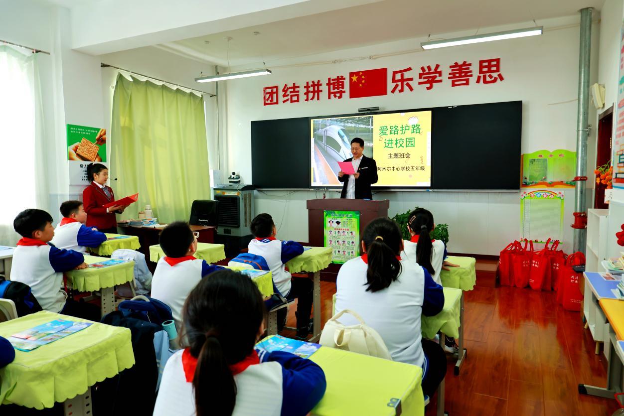 漠河站鐵路派出所的干警在向小學五年級學生講解鐵路安全注意事項(王力 攝)